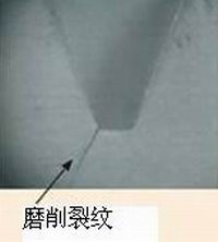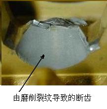 3、 假如帶涂層滾刀不褪涂直接復(fù)磨,因?yàn)?/span>涂層和滾刀基體的熱傳導(dǎo)率不同,基體材料傳導(dǎo)熱快,受熱后體積容易脹大;而涂層都是阻熱材料,熱傳導(dǎo)率差,熱傳導(dǎo)慢。這樣,已磨損的滾刀前刀面和后刀面基體外露部分,已無涂層,和還存在涂層的部分;在磨削時(shí),造成兩部分的熱傳導(dǎo)不均勻,膨脹不均勻,容易造成熱局部集中,基體材料組織內(nèi)產(chǎn)生熱應(yīng)力釋放,局部容易產(chǎn)生微細(xì)熱裂紋,尤其是在滾刀齒根圓弧部位。目前,褪涂層的方法是使用化學(xué)藥水浸泡法,把刀具上涂層化學(xué)反應(yīng)褪除。如果滾刀上存在微細(xì)裂紋,藥水容易進(jìn)入微細(xì)熱裂紋中,對(duì)基體長(zhǎng)時(shí)間(一般浸泡時(shí)間都在1小時(shí)左右)作用后,會(huì)腐蝕基體,造成裂紋擴(kuò)展,或出現(xiàn)基體鈷元素析出,造成鈷流失。物理涂層(PVD)溫度是在500℃左右,進(jìn)爐時(shí)間約10小時(shí),如果滾刀上存在微細(xì)裂紋,在高溫長(zhǎng)時(shí)間作用下,裂紋處容易擴(kuò)展和存在相反方向的排斥應(yīng)力。這樣,滾刀在滾切過程中,容易出現(xiàn)掉齒、崩刃、打刀等損壞問題。見下圖。