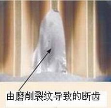 ⑶ 假如帶涂層插齒刀不褪涂直接復(fù)磨,因?yàn)?/span>涂層和插齒刀基體的熱傳導(dǎo)率不同,基體材料傳導(dǎo)熱快,受熱后體積容易脹大;而涂層都是阻熱材料,熱傳導(dǎo)率差,熱傳導(dǎo)慢。這樣,已磨損的插齒刀前刀面和后刀面基體外露部分,已無(wú)涂層,和還存在涂層的部分;在磨削時(shí),造成兩部分的熱傳導(dǎo)不均勻,膨脹不均勻,容易造成熱局部集中,基體材料組織內(nèi)產(chǎn)生熱應(yīng)力釋放,局部容易產(chǎn)生微細(xì)熱裂紋,尤其是在插齒刀齒根圓弧部位。目前,褪涂層的方法是使用化學(xué)藥水浸泡法,把刀具上涂層化學(xué)反應(yīng)褪除。如果插齒刀上存在微細(xì)裂紋,藥水容易進(jìn)入微細(xì)熱裂紋中,對(duì)基體長(zhǎng)時(shí)間(一般浸泡時(shí)間都在1小時(shí)左右)作用后,會(huì)腐蝕基體,造成裂紋擴(kuò)展,或出現(xiàn)基體鈷元素析出,造成鈷流失。物理涂層(PVD)溫度是在500℃左右,進(jìn)爐時(shí)間約10小時(shí),如果插齒刀上存在微細(xì)裂紋,在高溫長(zhǎng)時(shí)間作用下,裂紋處容易擴(kuò)展和存在相反方向的排斥應(yīng)力。這樣,插齒刀在插切過(guò)程中,容易出現(xiàn)掉齒、崩刃、打刀等損壞問(wèn)題。見(jiàn)下圖。